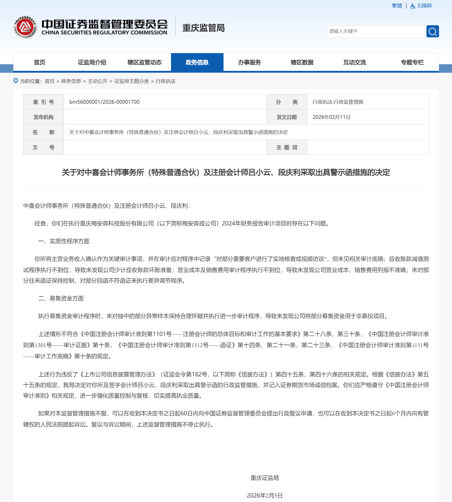 2月11日,重庆证监局官网发布关于对中喜会计师事务所(特殊普通合伙)(以下简称中喜所)及注册会计师吕小云、段庆利采取出具警示函措施的决定。