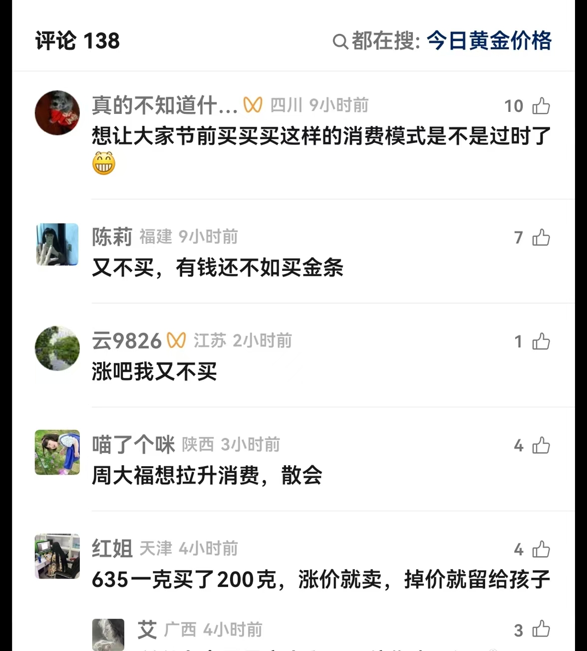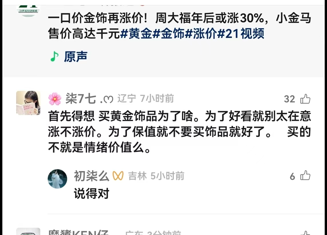 有消费者表示“买涨不买跌是投资常识”,看好黄金长期保值属性。有消费者则表示购金更看重情绪价值,对金价涨跌并不敏感。“为了好看就别在意涨不涨价,想保值就别买金饰。”还有部分消费者保持理性审慎态度,认为一口价产品包含较高的工艺溢价,表示“想保值,不如买金条划算。”还有消费者给出了更灵活的思路:“635元一克的时候买了200克,涨价就卖,跌价就留给孩子。”同时,也有消费者认为消息可能是品牌方趁春节旺季拉升消费的营销策略。