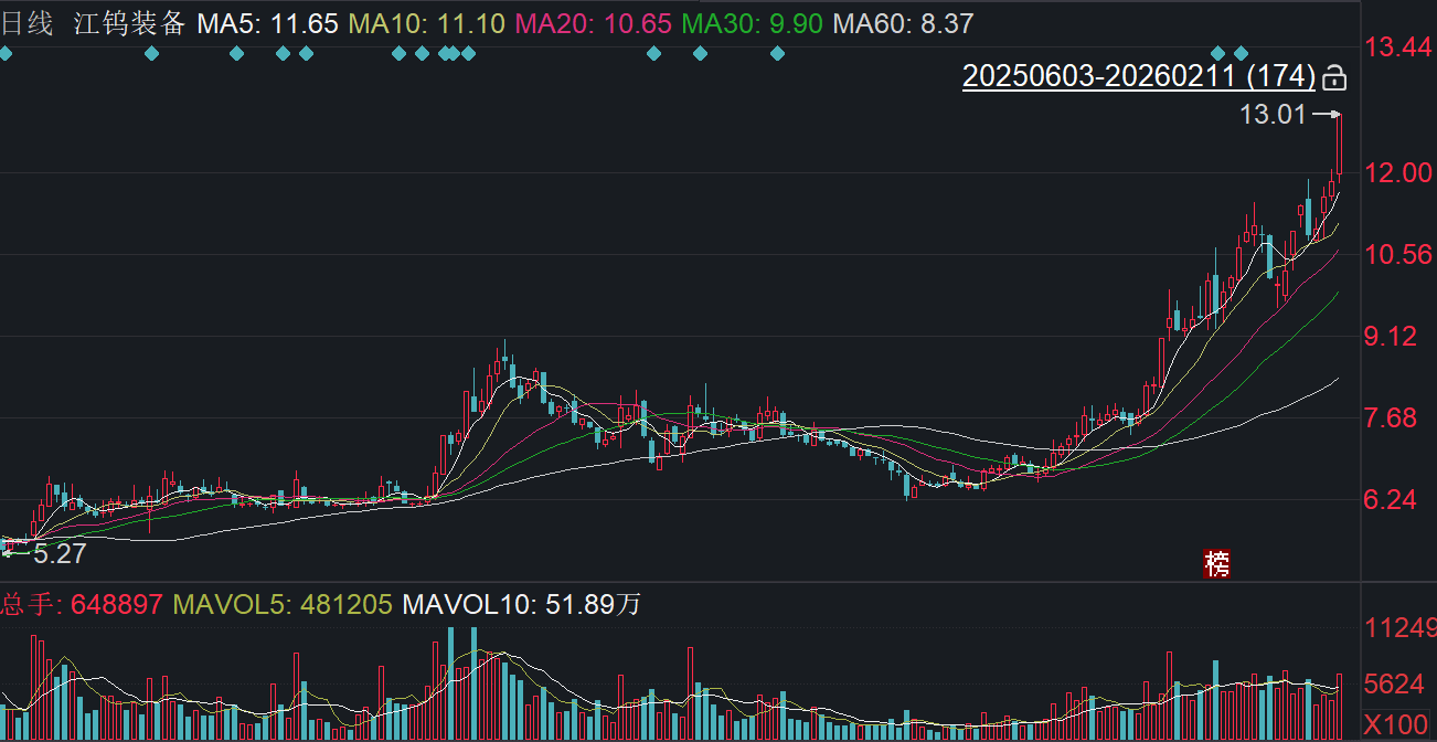 二级市场上,截至2月11日收盘,江钨装备涨停报13.01元/股,总市值约128.79亿元,近一年来累计上涨近170%。