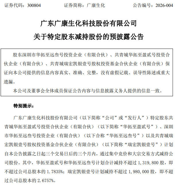 2月11日,广康生化(300804)公告,近日收到华拓至盈贰号、华拓至远叁号及瑞宏凯银壹号出具的《减持计划告知函》。