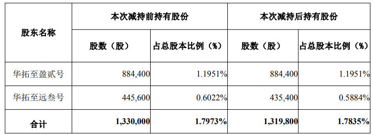 其中,华拓至盈贰号和华拓至远叁号计划合计减持不超过131.98万股,即不超过公司总股本的1.7835%;瑞宏凯银壹号计划减持不超过198万股,即不超过公司总股本的2.6757%。