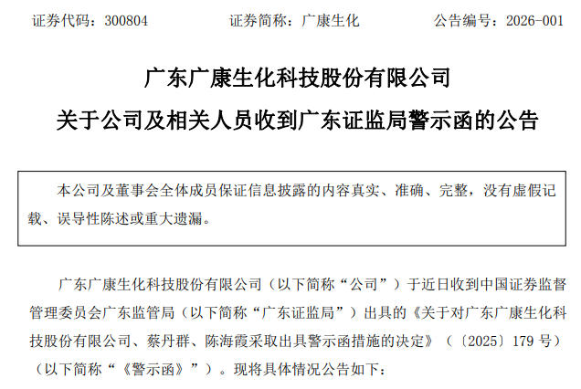 一个月前,广康生化收到了广东证监局下发的警示函。