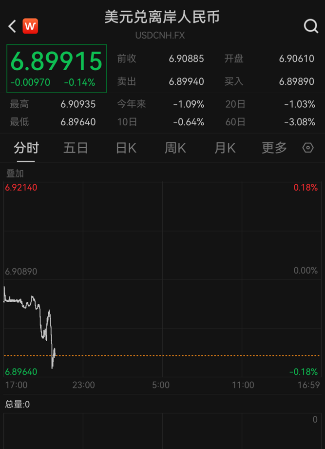 2月12日,离岸人民币兑美元涨破6.90关口,为2023年4月份以来首次。截至发稿,报6.89915。