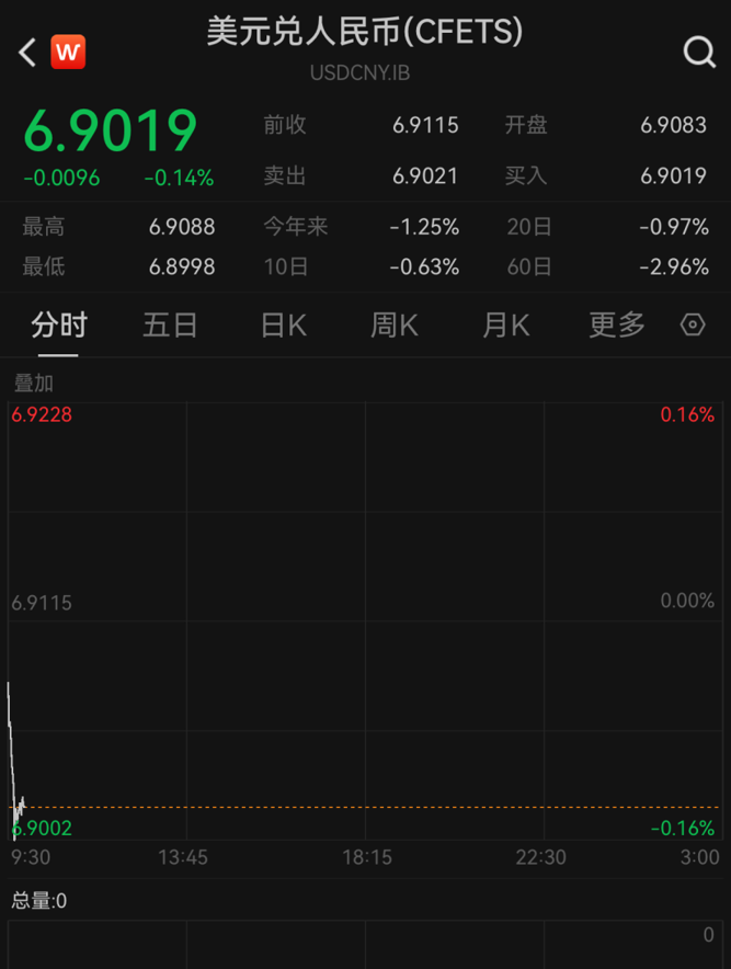 在岸人民币兑美元汇率盘中最高升至6.8998,亦创2023年4月以来新高,截至发稿,报6.9019。