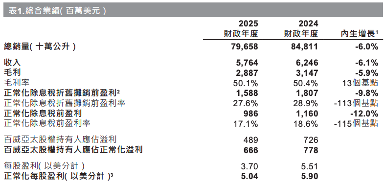 其中,2025年第四季度,公司总销量减少0.7%,主要是受到中国业务持续面对挑战及韩国行业疲弱的影响,但被印度的强劲增长所部分抵销。该季度,公司收入及每百升收入分别减少4.2%及3.5%。受公司的营收表现及补助减少以及投资增加所影响,正常化除息税折旧摊销前盈利减少24.7%;正常化除息税折旧摊销前盈利率则减少425个基点。