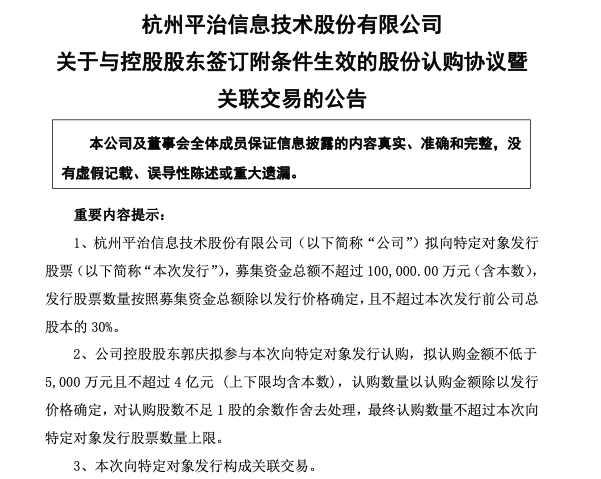 2月11日晚间,平治信息(300571)公告,公司拟向特定对象发行股票募集资金总额不超过10亿元,其中7亿元用于国产智能算力中心建设项目,3亿元用于补充流动资金。