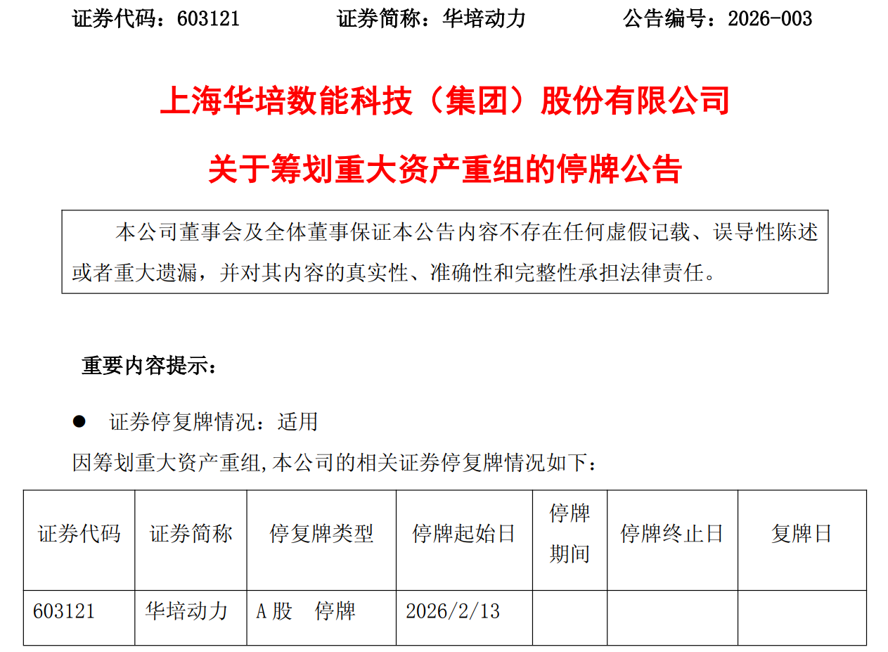 华培动力(603121)2月12日晚间公告,公司拟通过发行可转换公司债券及支付现金方式,购买无锡晟熠产业投资合伙企业(有限合伙)持有的美创智感(无锡)科技有限公司100%股权,并向不超过35名特定投资者发行股份募集配套资金。本次交易预计构成关联交易,构成重大资产重组,但不构成重组上市。公司A股股票自2026年2月13日(星期五)开市起开始停牌,预计停牌时间不超过10个交易日。