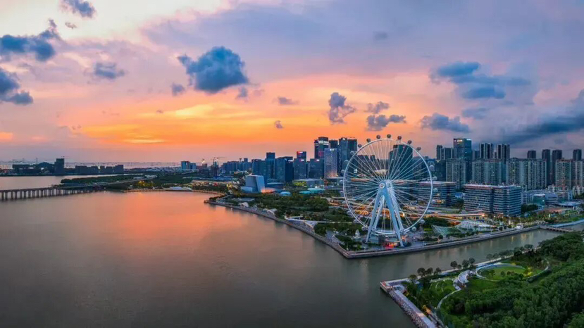 128米高的“湾区之光”摩天轮,恰似一条银色丝带轻挽海天,在伶仃洋的潮声中,迎送着每一轮日出日落,为城市天际线增添了一抹灵动的诗意。