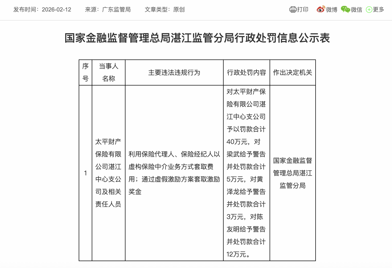 据2月12日国家金融监督管理总局湛江监管分局行政处罚信息公示表,太平财产保险一分公司收到罚单。
