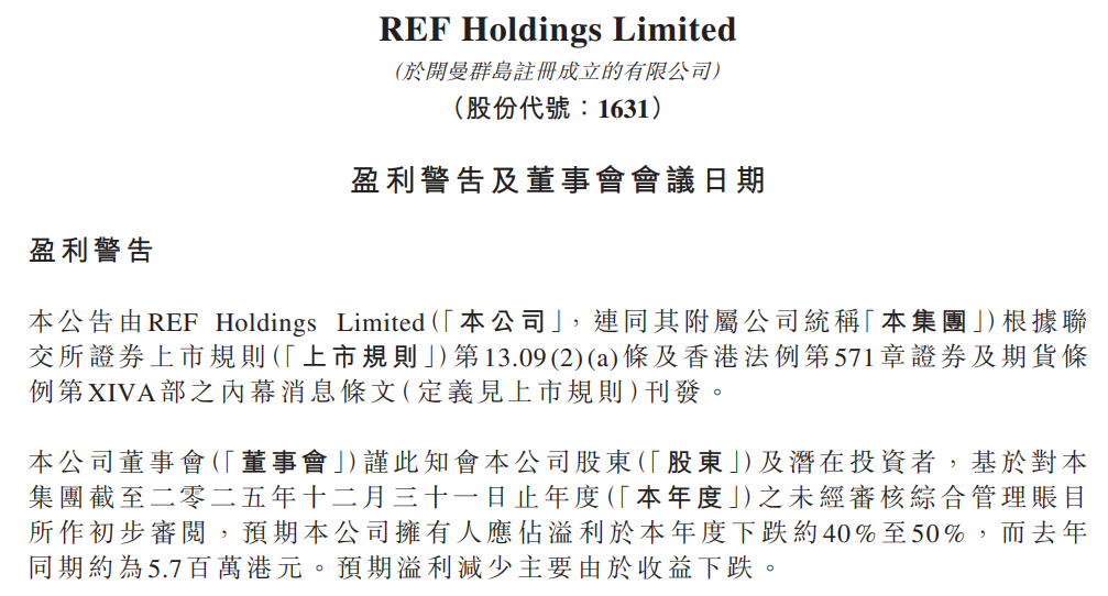 2月20日,REF HOLDINGS(01631)发布盈利警告,预期公司拥有人应占溢利于2025年年度下跌约40%至50%,而上年同期约为570万港元。预期溢利减少主要由于收益下跌。预期本集团于本年度之详细经审核综合财务业绩将于2026年3月5日刊发。
