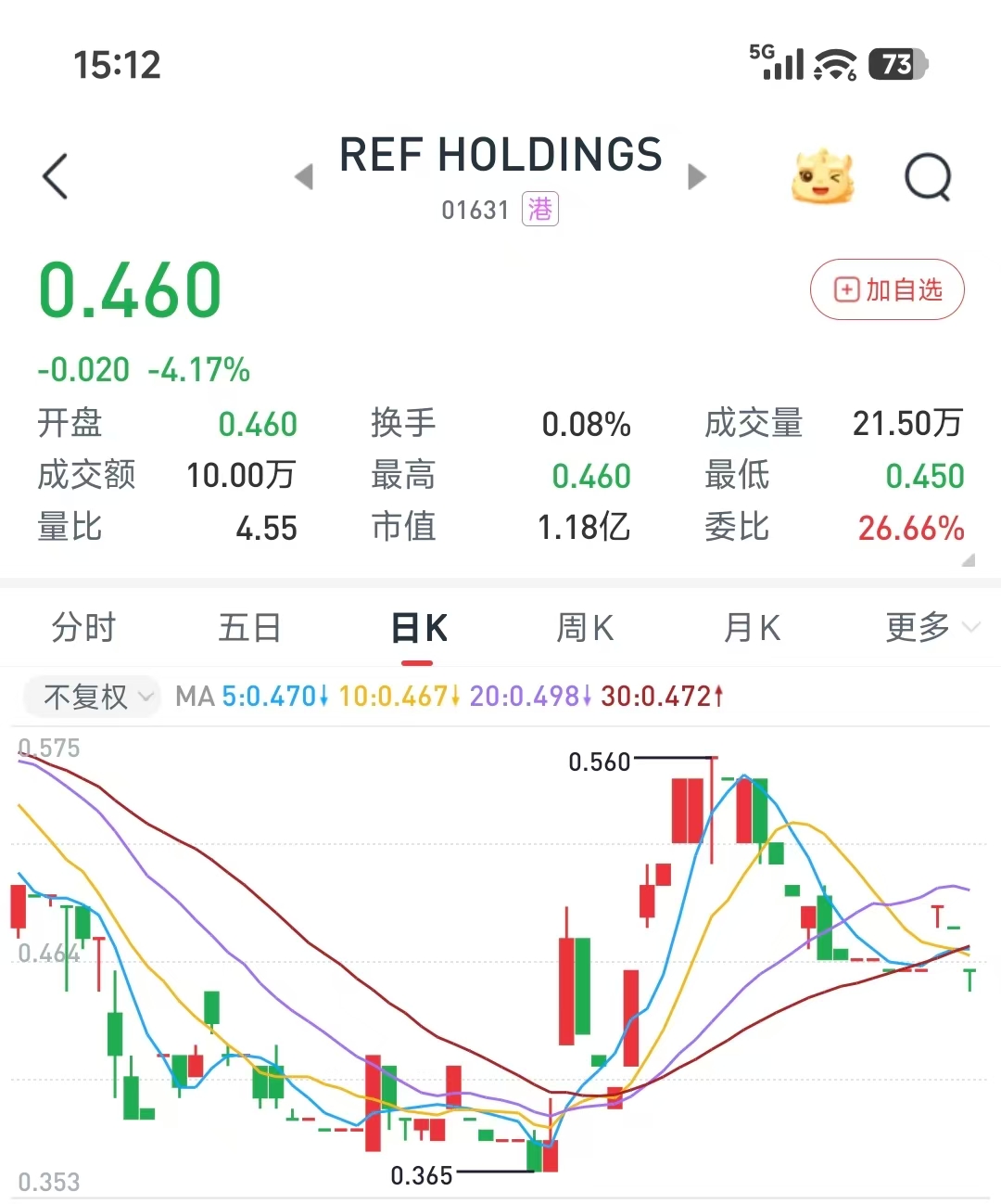 2月20日为港股马年首个交易日,当日港股跳水,REF HOLDINGS也未能独善其身,至15:12报0.46港元/股,跌4.17%,最新市值1.18亿港元。