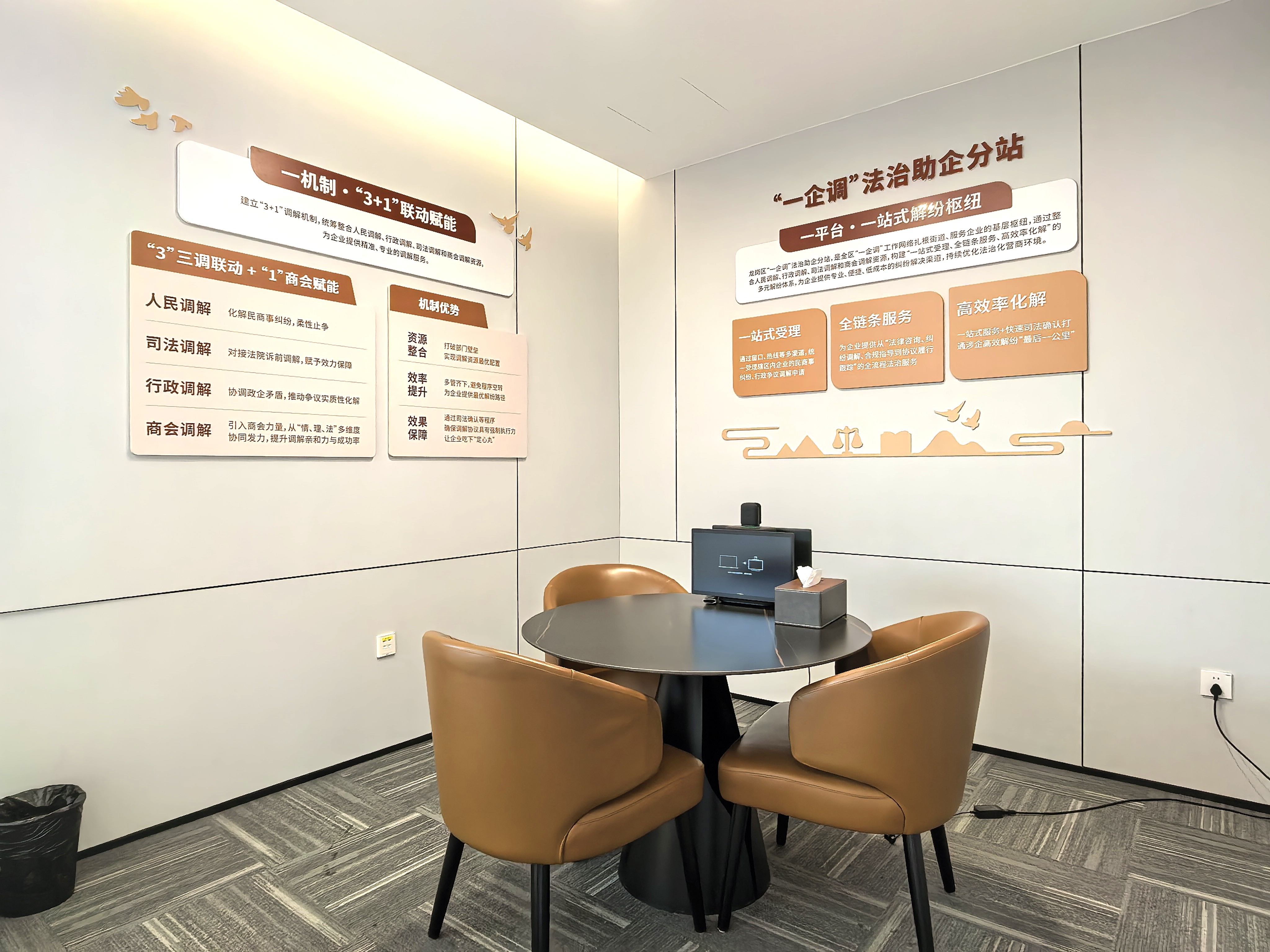 “一企调”法治助企服务站引入了AI双屏360度视频会议一体机,不仅支持远程调解,还具备多国语言实时翻译功能。无论是跨境纠纷化解还是涉外法律咨询,在这里语言不再是障碍,科技正在让法治服务跨越国界。