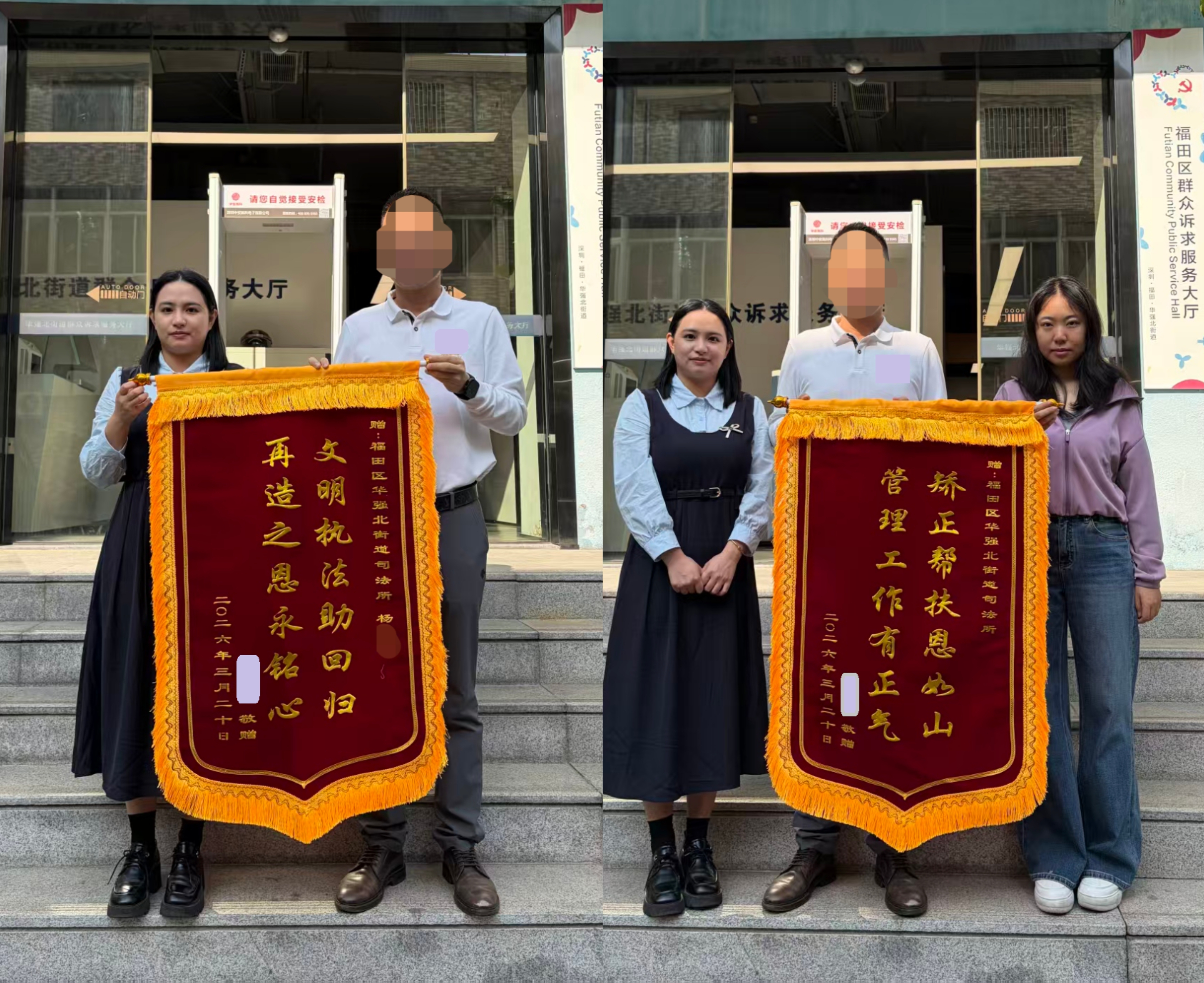 “矫正帮扶恩如山,管理工作有正气”“文明执法助回归,再造之恩永铭心”,3月18日上午,两面沉甸甸的锦旗被郑重地交到了福田区司法局派驻华强北街道社工和华强北街道司法所工作人员的手中。送锦旗的张某是一名即将于两日后解矫的社区矫正对象,他用这种朴素的方式诉说着自己的蜕变与感恩。锦旗上两份不同的致谢词,既是对基层司法所依法规范管理的认可,也是对派驻社工倾情帮扶的感谢,更彰显了福田区司法局坚持以人为本、推动社区矫正工作“法度与温度并重”的初心与实践。