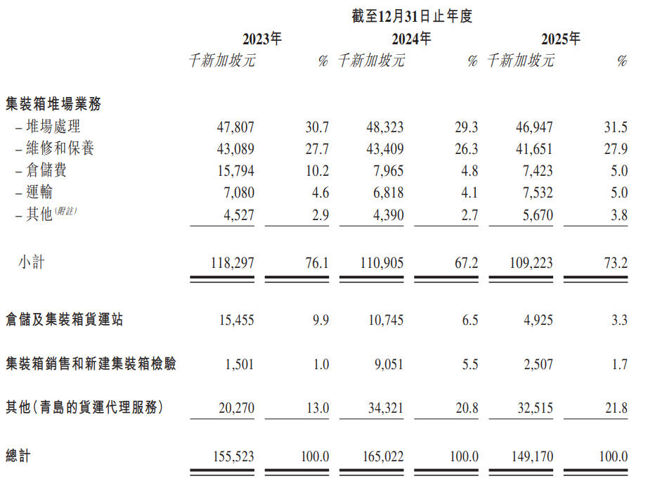 集装箱堆场业务是永康控股的核心业务,占公司总收益的绝大部分。截至2023年、2024年及2025年12月31日止年度,集装箱堆场业务的收入分别约为118.3百万新加坡元、110.9百万新加坡元及109.2百万新加坡元,分别约占总收益的76.1%、67.2%及73.2%。