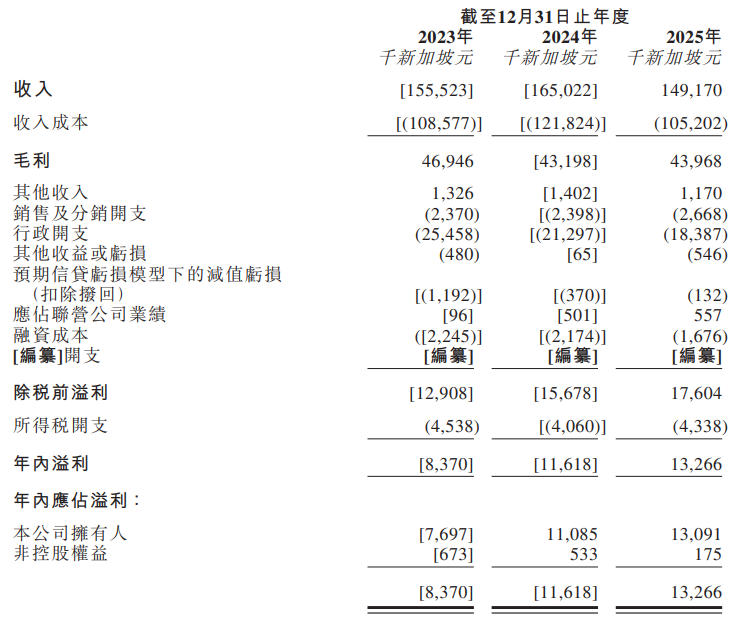 截至2023年、2024年及2025年12月31日止年度的毛利分别约为46.9百万新加坡元、43.2百万新加坡元及44.0百万新加坡元,而毛利率分别为30.2%、26.2%及29.5%。
