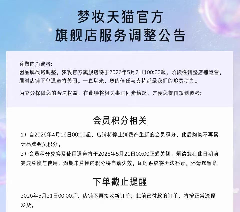 与之同时,梦妆还宣布,在中国的线上官方销售渠道(如官方商城、电商平台旗舰店)将服务至2026年6月30日正式关闭。