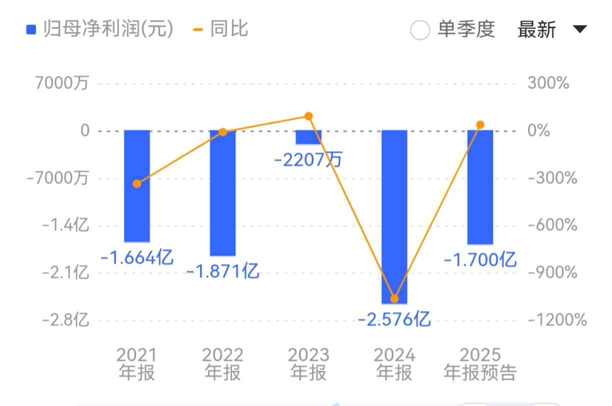 2021年至2024年,公司归母净利润分别亏损1.66亿元、1.87亿元、2207万元、2.58亿元。到了2025年,公司预计亏损1.50亿元至1.90亿元,扣除非经常性损益后预计亏损1.7亿元至2.1亿元。