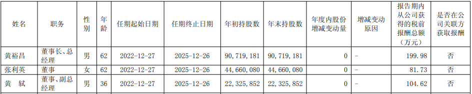 2024年年报显示,黄裕昌为公司控股股东、实际控制人,曾任德昌有限执行董事。2019年12月至今任公司董事长兼总经理。张利英为公司控股股东、实际控制人,曾任德昌有限监事。2019年12月至今任公司董事。黄轼为公司控股股东、实际控制人,2019年12月至今任公司董事兼副总经理。黄裕昌、张利英及黄轼报告期内从公司获得的税前报酬总额分别为199.98万元、81.73万元、104.62万元。