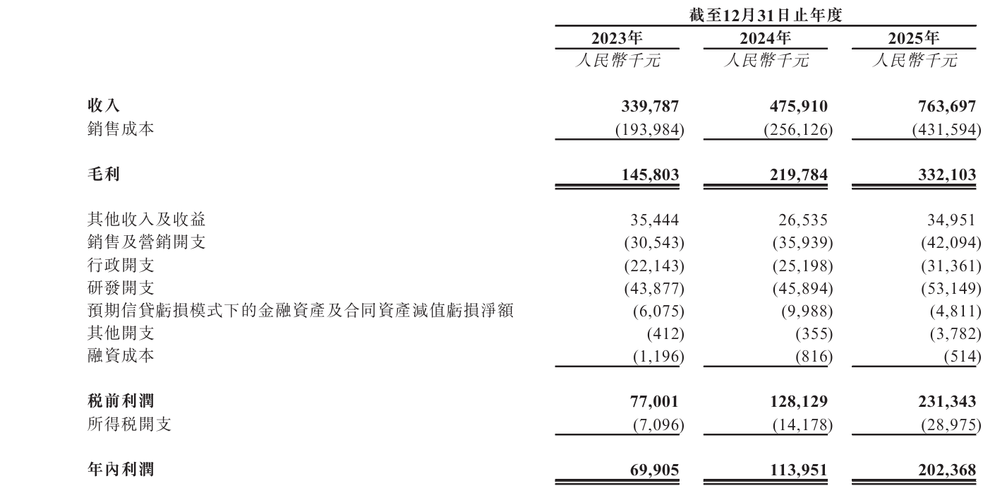 业绩方面,2023年至2025年(下称“报告期”),宜美智分别实现收入3.4亿元、4.76亿元和7.64亿元,年复合增长率为49.9%;年内利润分别为6990.5万元、1.14亿元和2.02亿元,年复合增长率高达70.2%,增速显著高于营收增长。