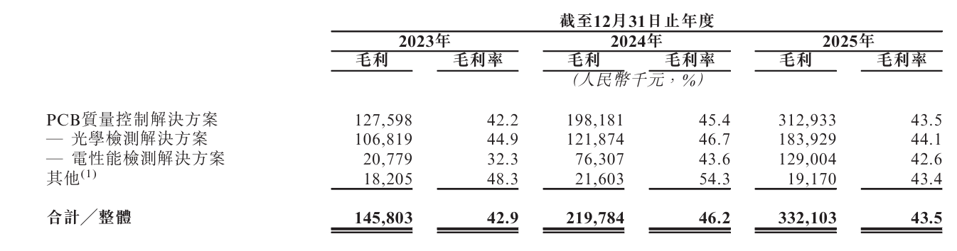 公司收入高度集中于PCB质量控制领域,报告期内占比均约九成。2025年,该板块内部约“六四开”:PCB光学检测解决方案收入4.17亿元,占比54.6%;PCB电性能检测解决方案贡献3.03亿元,占比39.6%,双产品线协同发力。