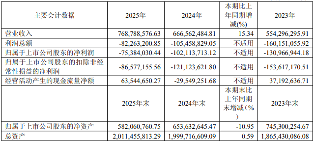 4月1日,气派科技(688216)披露2025年年度报告。2025年,公司实现营业总收入7.69亿元,同比增长15.34%;归母净利润亏损7538.4万元,上年同期亏损1.02亿元;扣非净利润亏损8657.72万元,上年同期亏损1.21亿元;经营活动产生的现金流量净额为6354.47万元,上年同期为-2954.93万元;报告期内,气派科技基本每股收益为-0.71元,加权平均净资产收益率为-12.20%。