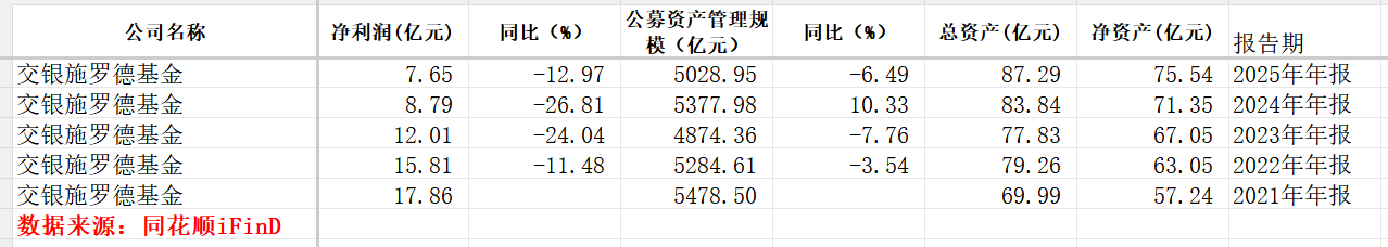 年报显示,老牌银行系公募交银施罗德基金2025年实现净利润7.65亿元,较2024年的8.79亿元下降12.97%;同期公募行业经营情况整体回暖,多家银行系公募净利增长。而这已是该公司净利润连续第四年下滑:据同花顺数据,2022年~2024年,公司净利润依次下滑11.48%、24.04%与26.81%。