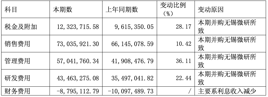 报告期内,公司营业成本、销售费用、管理费用及研发费用均同比增长,主要系本期并购无锡微研,各项费用增加;营业收入同比增长系无锡微研并表后,模具产品等销售增加。