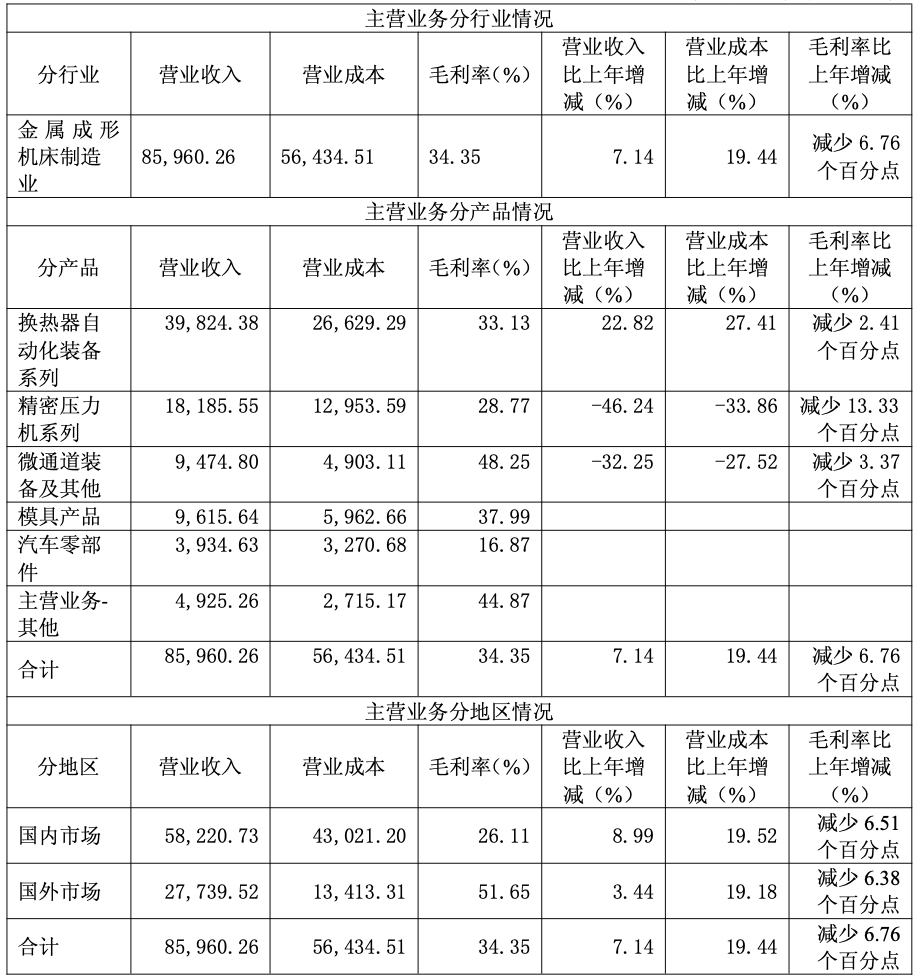分产品来看,换热器自动化装备系列、精密压力机系列、微通道装备及其他业务毛利率均较上年同比减少。此外,精密压力机系列营业收入较上年同比减少46.24%,微通道装备及其他业务营业收入较上年同比减少32.25%。