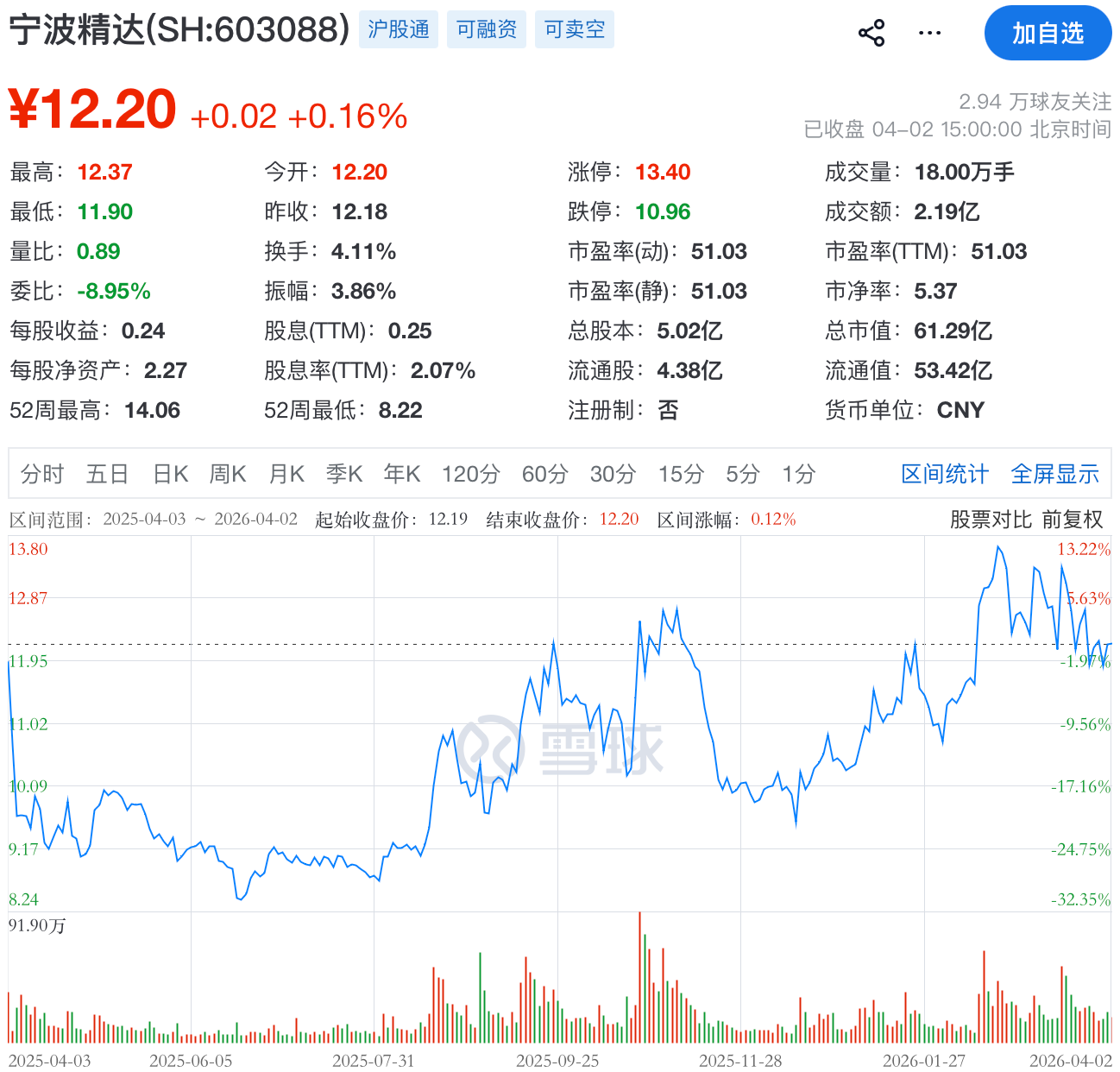 二级市场上,截至4月2日收盘,宁波精达上涨0.16%报12.20元/股,总市值约61.29亿元。