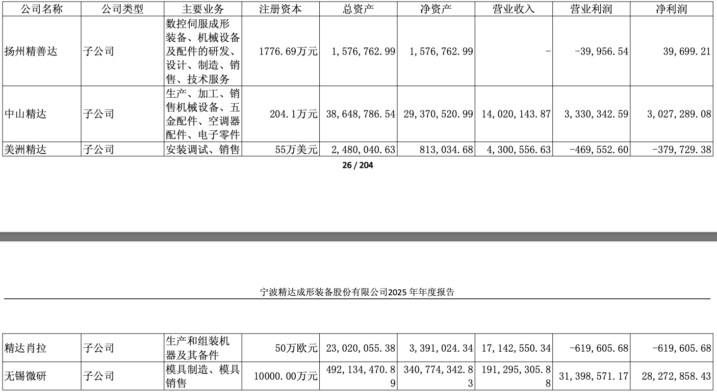 同时,2025年3月,公司与JAN PETER SCHÖLER合资,在德国设立了JS Machinery GmbH(精达肖拉),公司持有90%股份,精达肖拉为公司控股子公司,纳入合并范围。2025年9月,公司设立了宁波精达成形科技有限公司,从事金属成形设备销售及模具销售,机械零部件等相关业务。公司持有100%股份,宁波精达成形科技有限公司为公司控股子公司,纳入合并范围。