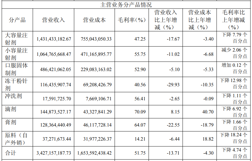 大容量注射剂收入14.31亿元,同比下降17.67%,毛利率下降7.79个百分点,成为拖累业绩的主力。冻干粉针剂收入1.16亿元,同比大降29.93%,毛利率下降12.98个百分点。