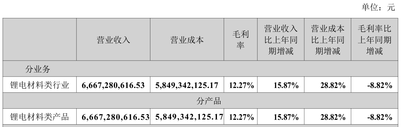 在毛利率表现方面,锂电材料业务的盈利能力随统计口径的变化出现了波动。更正后,该板块的毛利率修正为12.27%,较原先披露的13.62%有所下降 。受行业整体环境影响,尽管收入端实现了两位数增长,但毛利率比上年同期下降了8.82% 。