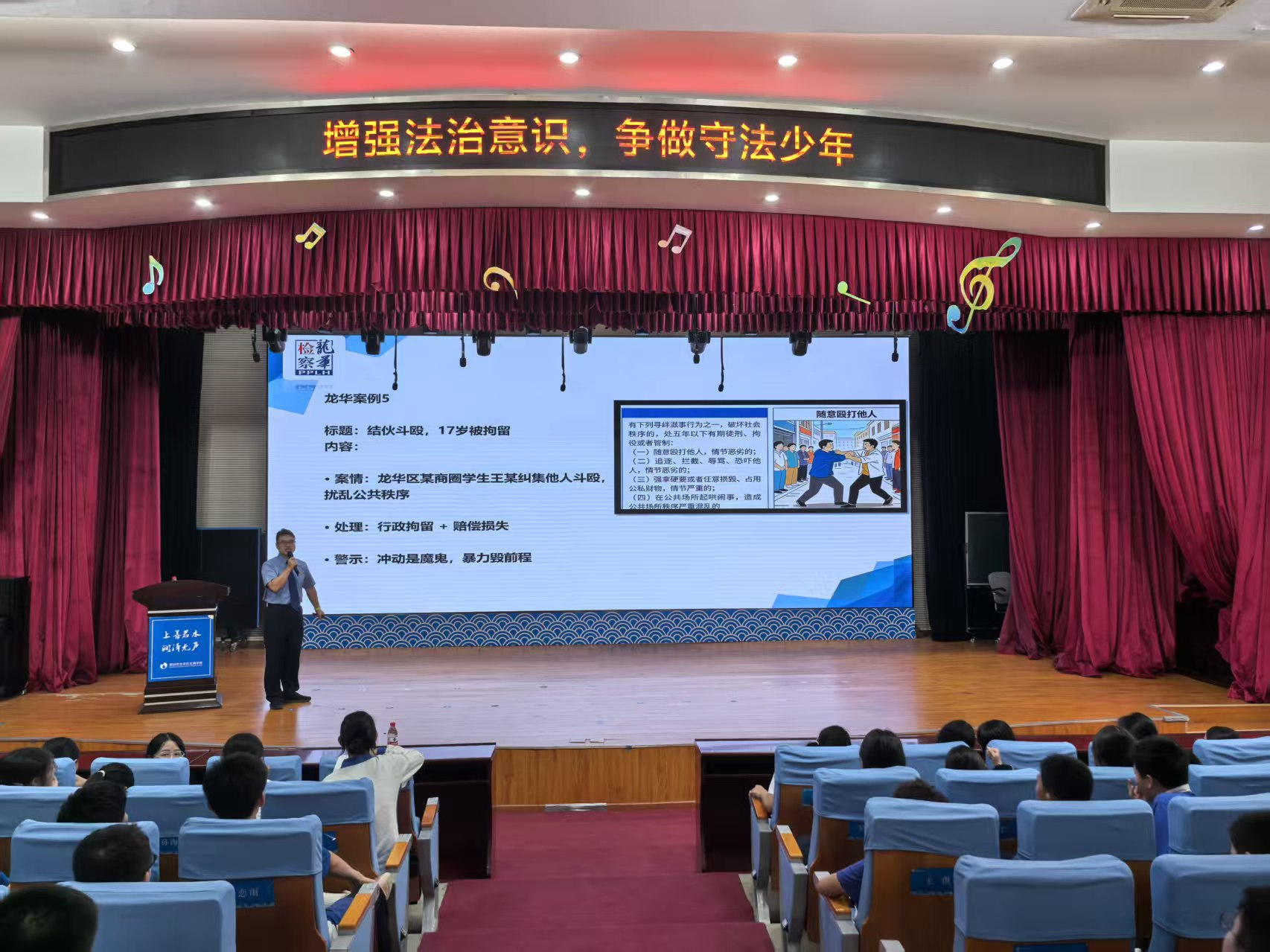 讲座伊始,检察官结合未成年人的身心特点与认知规律,用通俗易懂的语言、生动鲜活的案例,从校园欺凌、网络诈骗、网络语言攻击、交通安全等与学生日常生活紧密相关的场景切入,深入浅出地解读治安管理处罚法中关于违法行为的界定、处罚种类及法律后果。检察官强调,这部新修订施行的法律打破了“法不责幼”的认知误区,未成年人违法并非完全免责,情节严重的仍将依法处置。