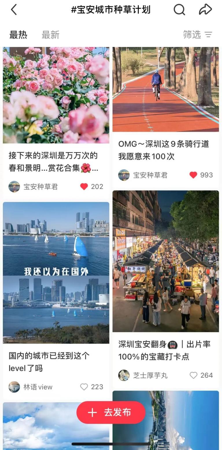 自从宝安开启城市种草计划,在小红书和抖音的#宝安城市种草计划 话题里,满屏都是网友打卡的宝安美景和美食,让大家看见了不一样的宝安。