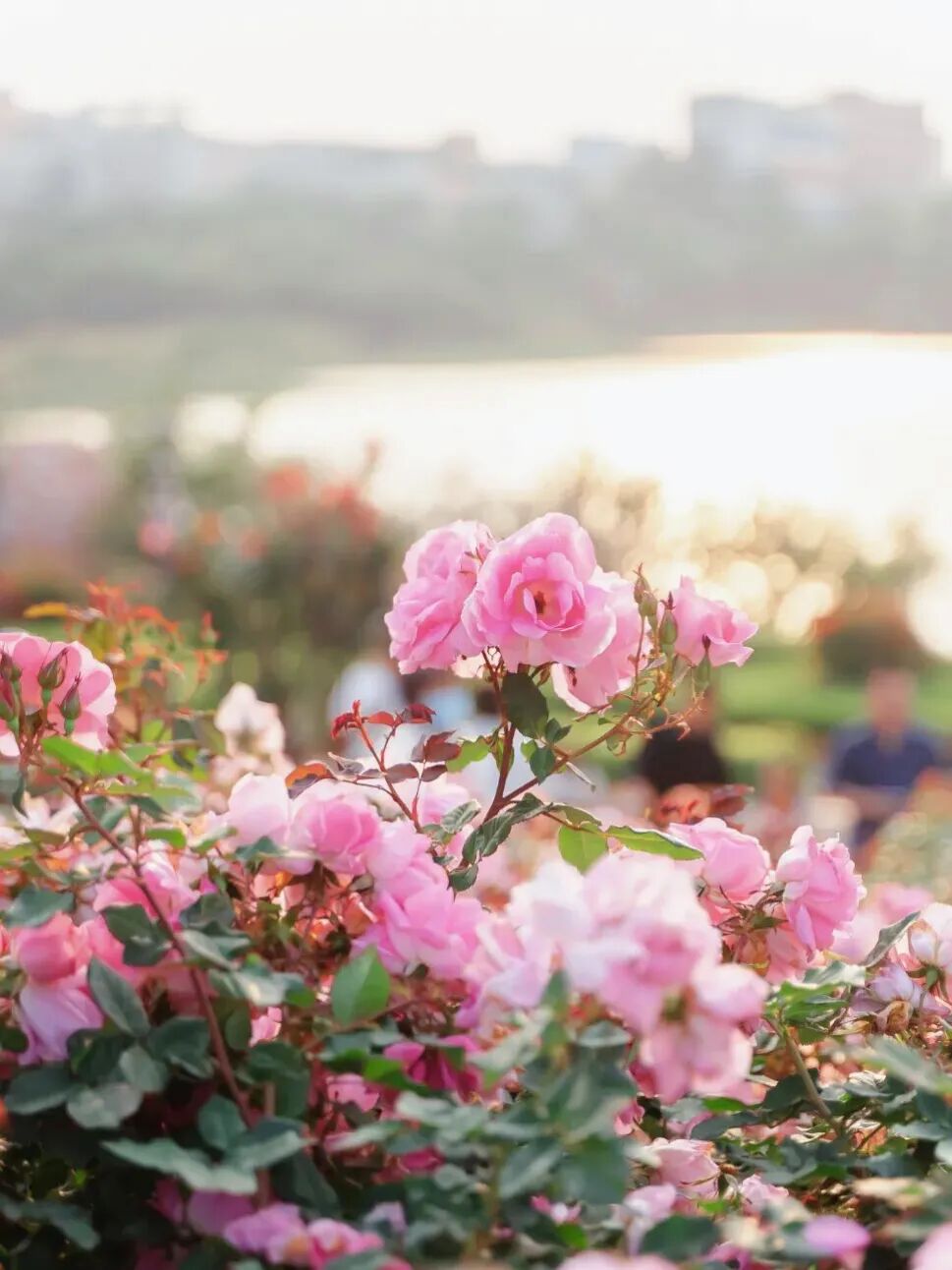 湖畔边藏着一片近2000平方米的月季园,近万株珍稀月季开得正盛,色彩层层叠叠。简阅书吧旁的花境尤其出片,湖光伴着花香,走一圈格外治愈。