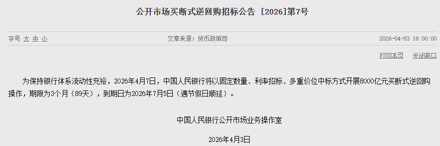 央行网站4月3日电,为保持银行体系流动性充裕,2026年4月7日,中国人民银行将以固定数量、利率招标、多重价位中标方式开展8000亿元买断式逆回购操作,期限为3个月(89天),到期日为2026年7月5日(遇节假日顺延)。