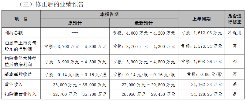 4月3日晚间,准油股份(002207)业绩预告修正公告,公司修正2025年度业绩预告,营业收入从3.30亿元~3.60亿元下调至2.70亿元~2.95亿元,扣除后营业收入从3.27亿元~3.57亿元下调至2.695亿元~2.945亿元,归母净利润预计亏损3700万元~4300万元。