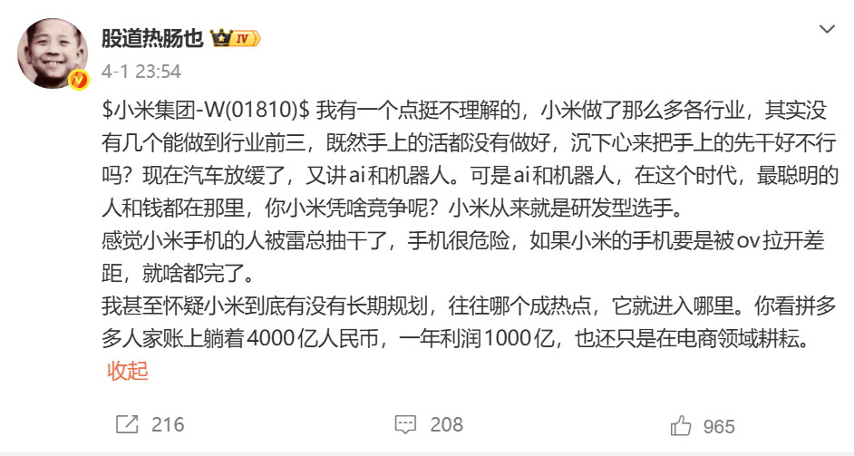 日斗投资董事长王文在微博上直言:“小米做了那么多个行业,其实没有几个能做到行业前三,既然手上的活都没有做好,沉下心来把手上的先干好不行吗?现在汽车放缓了,又讲AI和机器人。可是AI和机器人,在这个时代,最聪明的人和钱都在那里,你小米凭啥竞争呢?我甚至怀疑小米到底有没有长期规划,往往哪个成热点,它就进入哪里。”