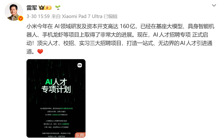 3月30日,雷军在其微博宣布,小米今年AI领域研发及资本开支高达160亿元。同时,小米正式启动AI人才招聘专项计划,开放顶尖人才、校园招聘、实习三大招聘赛道,打造一站式、无边界的AI人才引进体系。