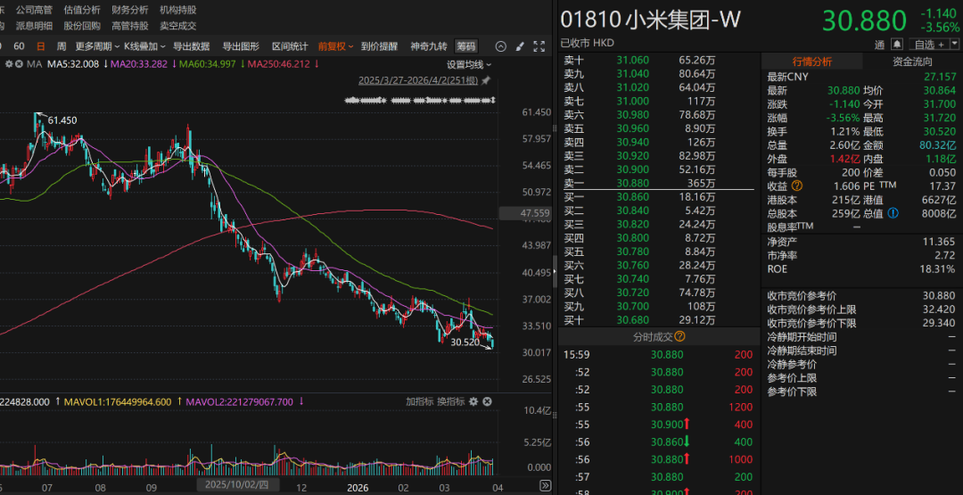 从小米集团的股价表现看,2025年年中以来震荡下行,截至4月2日收盘,股价不足31港元,创下2025年以来的新低。同2025年年中的股价高点相比,已经处于腰斩状态。