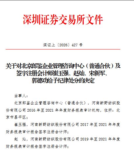 4月3日,深交所公布《关于对北京郎鉴企业管理咨询中心(普通合伙)及签字注册会计师崔玉强、赵灿、宋新军、郭德功给予纪律处分的决定》。北京郎鉴企业管理咨询中心(普通合伙)曾用名为“亚太(集团)会计师事务所(特殊普通合伙)”。
