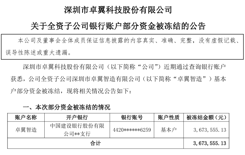 本次卓翼智造基本户部分资金被冻结,系惠州市博晖连接技术有限公司与卓翼智造买卖合同纠纷事宜,博晖公司向广东省深圳市宝安区人民法院提出财产保全申请所致。卓翼智造已收到民事裁定书、保全结果通知书、仲裁申请书等相关法律文书。本次冻结金额为人民币3,673,555.13元。