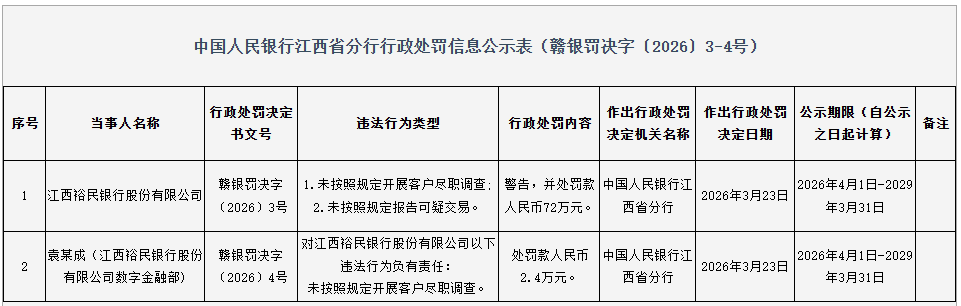近日,中国人民银行江西省分行发布的行政处罚决定书显示,江西裕民银行股份有限公司因未按照规定开展客户尽职调查以及未按照规定报告可疑交易,被警告并罚款72万元。同时,袁某成(江西裕民银行股份有限公司数字金融部)被罚款2.4万元。