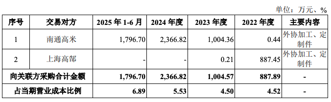 此前披露的申报材料显示,2022年至2024年,公司向关联方南通高米采购金额分别为0.44万元、1004.36万元、2366.82万元和1796.70万元;2022年和2023年,公司向关联方上海高郜采购金额分别为887.45万元、0.21万元,公司在2023年后未再向上海高郜采购。