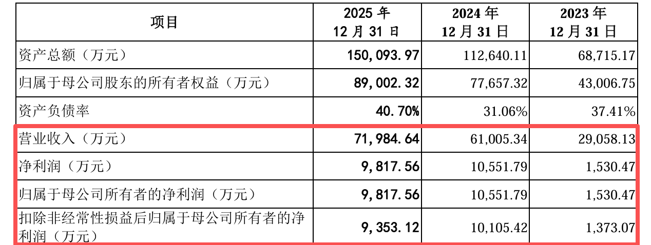 业绩方面,2023年至2025年(下称“报告期”),公司营业收入分别为2.91亿元、6.10亿元和7.20亿元,复合增长率达57.39%;然而,其归母净利润却走出过山车行情:前两年分别为1530.47万元、1.06亿元稳步攀升,去年却骤降至9817.56万元,同比"掉头"向下。