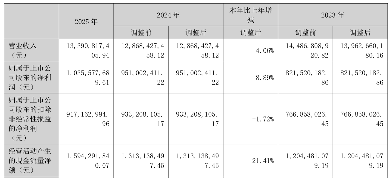 4月6日晚间,万向钱潮(000559)发布2025年年度报告,公司全年实现营收133.91亿元,同比增长4.06%;归母净利润为10.36亿元,同比增长8.89%,增速较2024年的15.76%大幅放缓;扣非净利润为9.17亿元,同比微降1.72%。