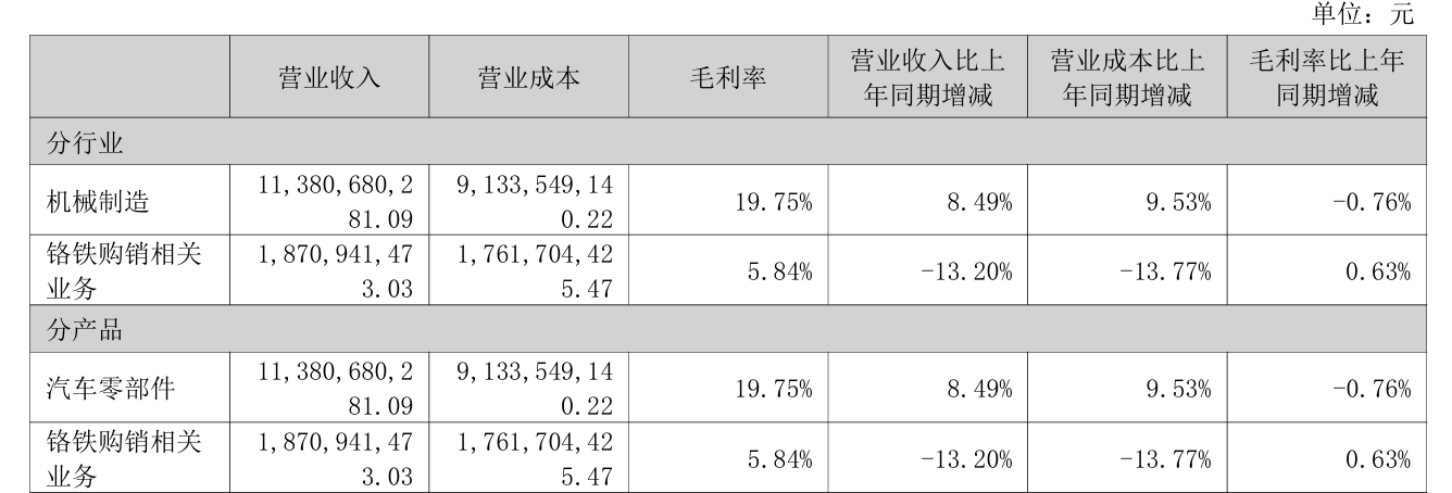 分产品来看,公司两大业务走势分化:汽车零部件营收占比84.99%,收入同比增长8.49%,但毛利率下滑0.76个百分点,增收不增利特征显现;铬铁购销占比13.97%,收入同比下降13.20%,毛利率却微增0.63个百分点。
