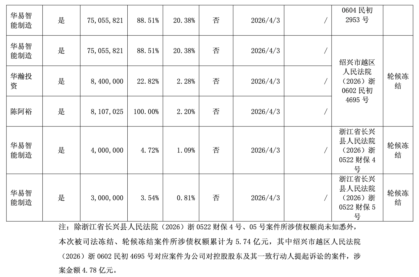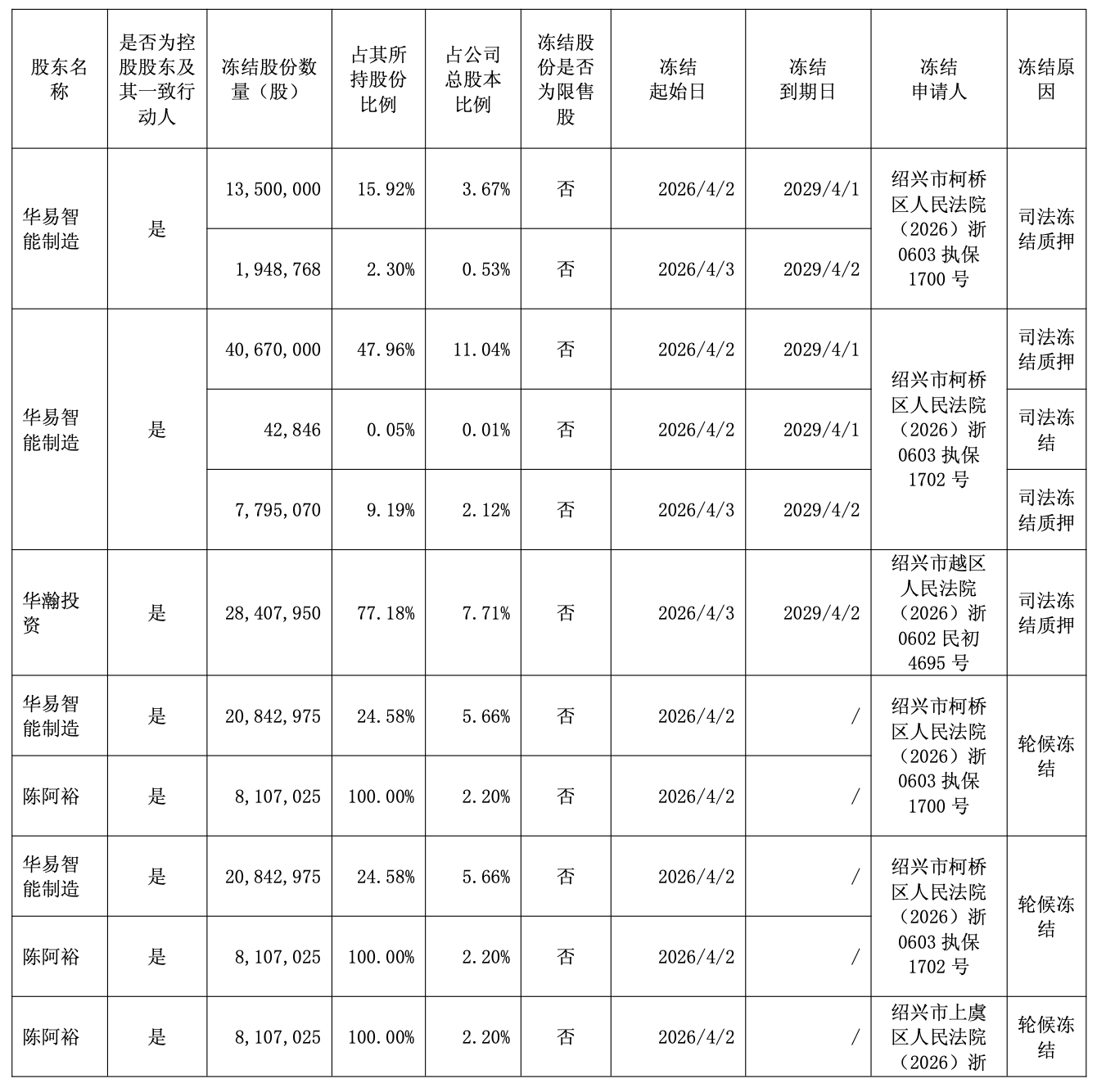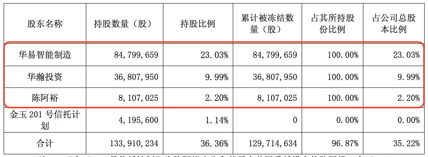 目前,华易智能制造、华瀚投资、陈阿裕的全部持股已被冻结。