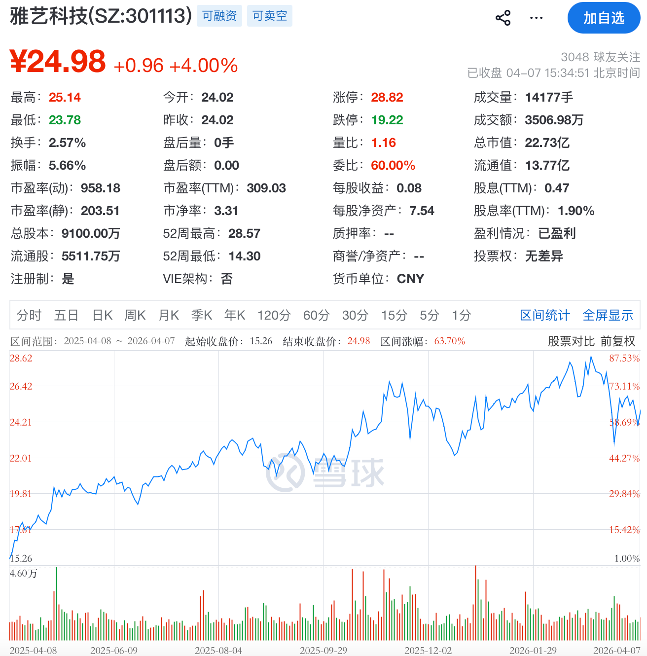 二级市场上,截至4月7日收盘,雅艺科技上涨4.00%报24.98元/股,总市值约22.73亿元。