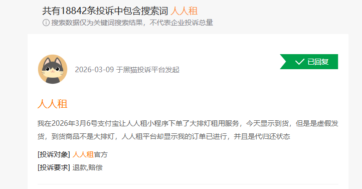 此外,人人租更是“投诉缠身”——在黑猫投诉平台上,共有18841条投诉中包含搜索词人人租。